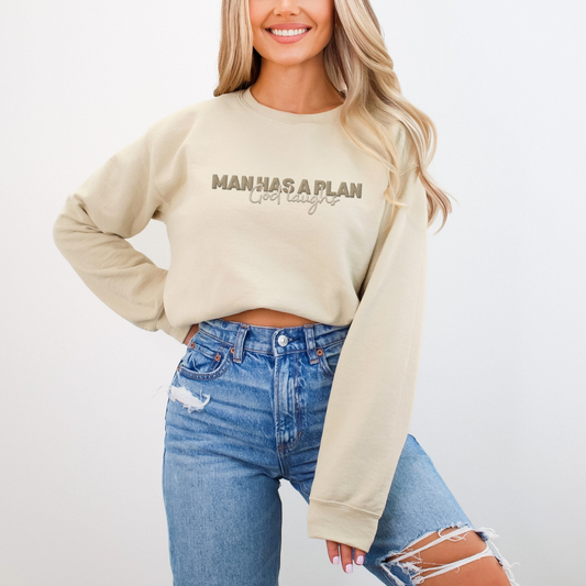 Man Has a Plan, God Laughs Embroidered Crewneck – Faith with a Sense of Humor